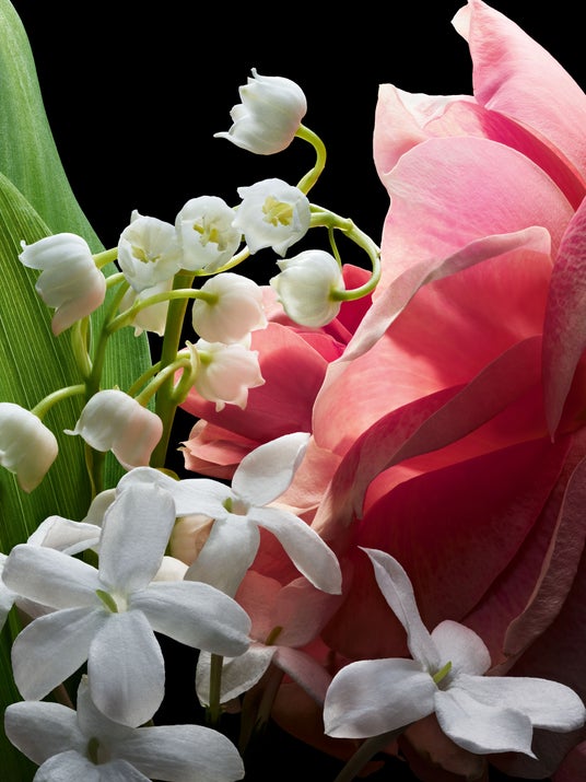 まるでクリスタルを透過する光のように、〈ミュゲ〉は、優しさと鮮やかさを兼ね備えたグリーンとローズのアクセントを織り交ぜています。それは幸運をもたらす鈴型の花々を最も純粋な輝きで想起させ、儚く優美でありながら生命力に満ちています。ブーケの中心には、まさにその瞬間に摘み取られたばかりのような完璧な幻想が宿り、永遠の春への約束を秘めています。