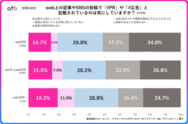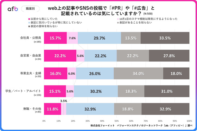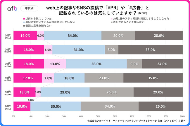 パフォーマンステクノロジーネットワーク「afb(アフィビー)」< https://www.afi-b.com/ >の開発運用をおこなう株式会社フォーイットは、全国の10代~60代までの男女500人を対象にPR表記に関するアンケートを実施し、年代別・職業別等の特徴についてまとめました。