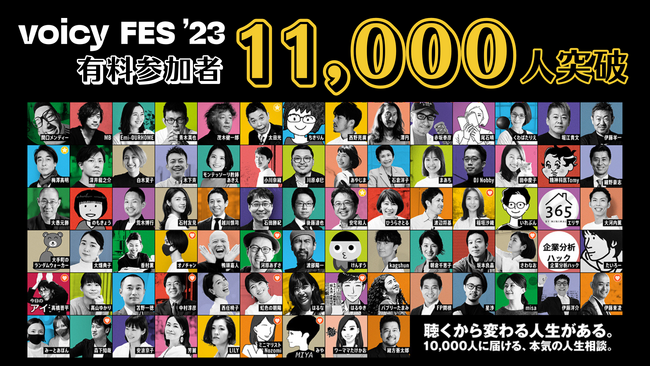 音声プラットフォームVoicyを運営する株式会社Voicyは、声の祭典「Voicy FES ’23」を2023年10月25日(水)から27日(金)の3日にわたって開催、過去最多の総勢79名のパーソナリティによる58の対談をお届けしました。三回目の開催となった今年、前回を大きく上回る11,000人以上の方がチケット(税込3,900円)を購入しました。「Voicy FES ’23」は、11月末までアーカイブ放送を配信・販売しています。なお、リスナーの投票によるベスト対談ランキングの中間発表を実施しました。今後もVoicyは、“声”で人や社会をより豊かにするために、多くの方に音声を楽しむ体験を届けていきます。