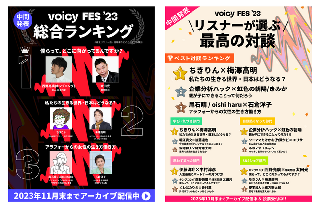 再生リスナー数・完聴率などのデータ(10月31日時点)から算出した総合ランキングおよびリスナーの投票(11月1日正午時点)によるベスト対談ランキングの中間発表を実施しました。