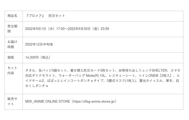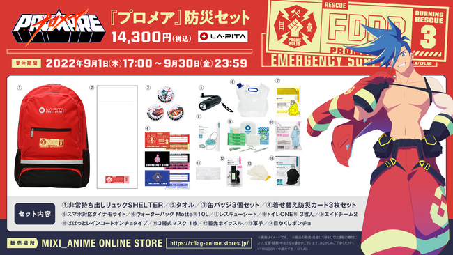 株式会社ミクシィ(東京都渋谷区、代表取締役社長:木村 弘毅)は、アニメーションスタジオ「TRIGGER」と、初めて共同製作したオリジナル劇場アニメーション作品『プロメア』において、防災用品大手の株式会社LA・PITAとコラボし、作中に登場する高機動救命消防隊「バーニングレスキュー」をイメージした防災用品のセットをECサイト「MIXI_ANIME ONLINE STORE」で2022年9月1日(木)17:00より期間限定で受注販売します。