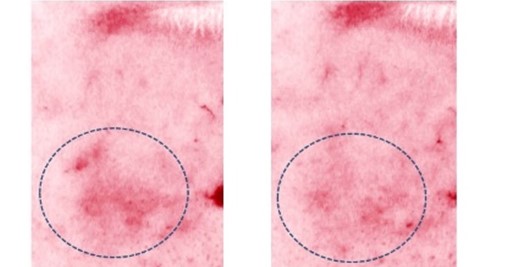 シミは、肌の一部にメラニン色素などが沈着することにより、周囲の肌色と比べて明るさの差が生まれることによる色ムラです。そのためシミの目立ち具合は、該当する部位のメラニンの量と相関すると考えられています。しかし、画像処理技術を用いてシミの色を構成している色素ごとに分解してシミの見え方の違いを確認したところ、シミの部位の元画像からメラニンの茶色を取り除いても赤色が残るためシミの存在感が消えずに目立ったままであり(1.)、赤色を取り除くことでシミの存在感が軽減する(2.)ことがわかりました。シミの部位では、肌表面近くまで血管が近づいていることが知られているため、シミの存在感に影響を与える赤みは、血管内の赤い色素のヘモグロビンによるものだと考えられます。