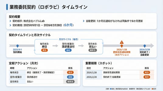 ▶︎生成された契約タイムラインの例:AIが自動生成した契約タイムラインのスライド画像の例。契約期間内の主要なイベントや契約更新前の重要期限などを可視化しています。