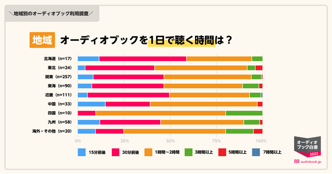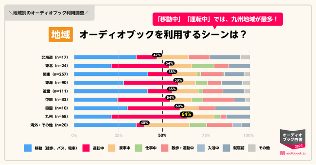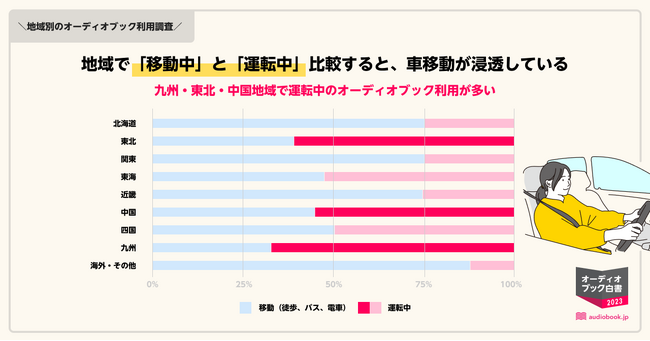 回答者全体(図1)ではユーザーの57%が「移動中(徒歩、バス、電車)」「運転中」で利用していることがわかりました。地域別(図2)を見ると、移動中、運転中でのオーディオブック利用が高いこと地域は「九州」でした。