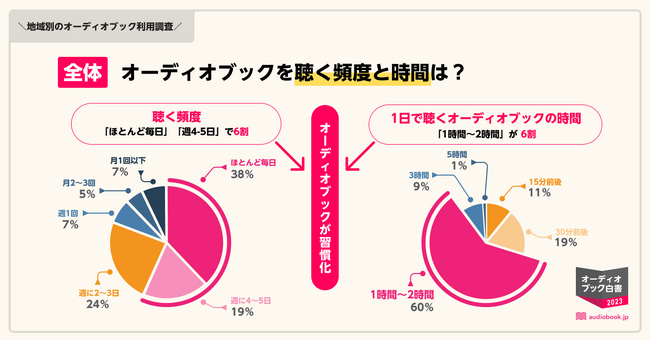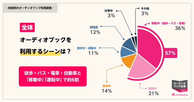 さまざまな生活シーンでオーディオブックが利用されるようになり、特に「移動時間(徒歩、バス、電車、自動車含む)」での利用は、全体の約6割を占めており、音楽やラジオを聞く感覚で習慣化されてきています。