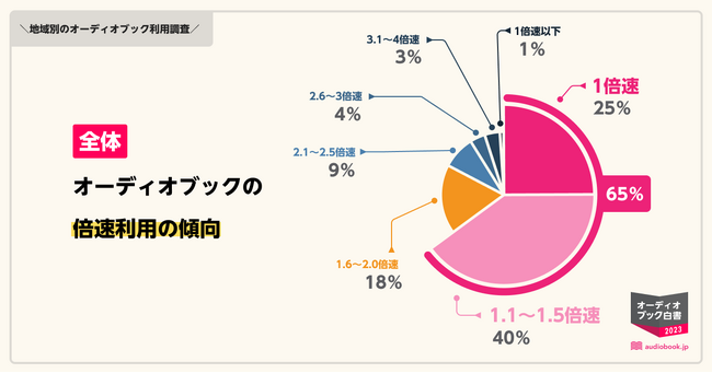 ユーザーの倍速利用傾向を調査し、全体(図7)で見るとユーザーの約65%が1.0倍速~1.5倍速で聴いていることがわかりました。