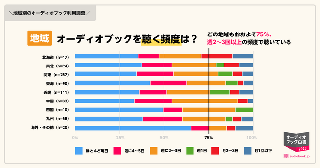 全体(図4)での聴く頻度は「ほとんど毎日」「週4~5日」で約60%とオーディオブックが習慣化しているユーザーが多いことがわかりました。図5のように地域別でみると大きな偏りなくユーザーの方がオーディオブックを聴いていることがわかります。