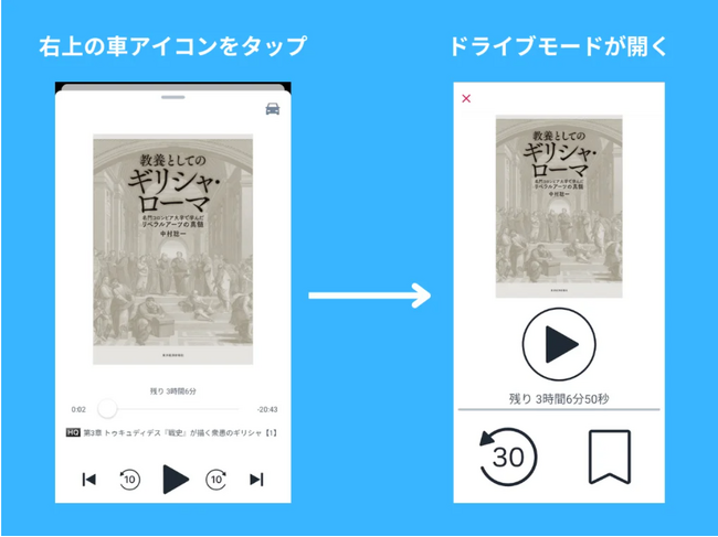 運転中に特化したドライブモードの再生画面でオーディオブックを楽しむことができます。