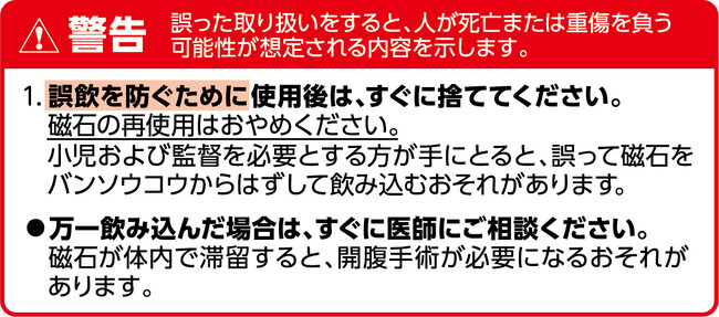 これを受け、磁石とバンソウコウが一体となった医療機器である「ピップエレキバン」シリーズにおいても、使用後の磁石誤飲について、改めてお客様にご注意いただきたくご案内いたします。