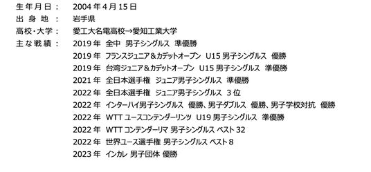7thシーズンから琉球アスティーダに入団して成長著しい鈴木選手と、今シーズンも一緒に戦えることを心より嬉しく思います。鈴木選手はパワフルなプレーでチームに貢献してくれて間違いなく次世代の卓球界を牽引していく逸材です。今シーズンもその若さと勢いで琉球アスティーダの王座奪還に向けて活躍してくれることを期待しています。