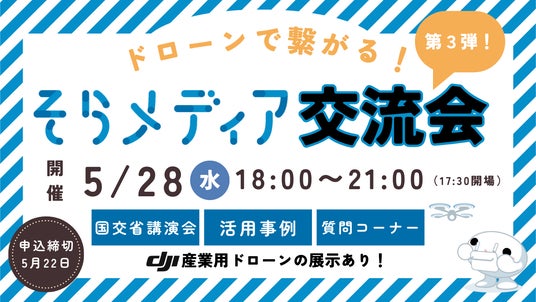 中京テレビ放送株式会社(本社:名古屋市中村区 代表取締役社長:伊豫田 祐司)のドローンスクール「そらメディア」は、5月28日(水)にドローンで繋がる交流会の第3弾を開催することをお知らせいたします。
