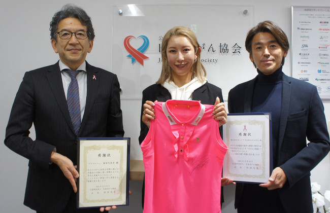 弊社所属のプロゴルファー金田久美子(かねだくみこ/32)がゴルフアパレルブランド「MARK & LONA(マーク & ロナ)」と企画開発したピンクリボン活動支援製品「フラミンゴモデル」の売上利益全額を、公益財団法人日本対がん協会に寄付いたしました。