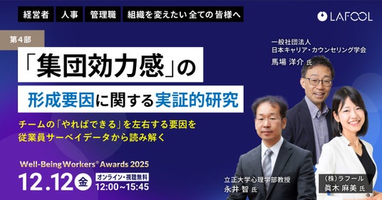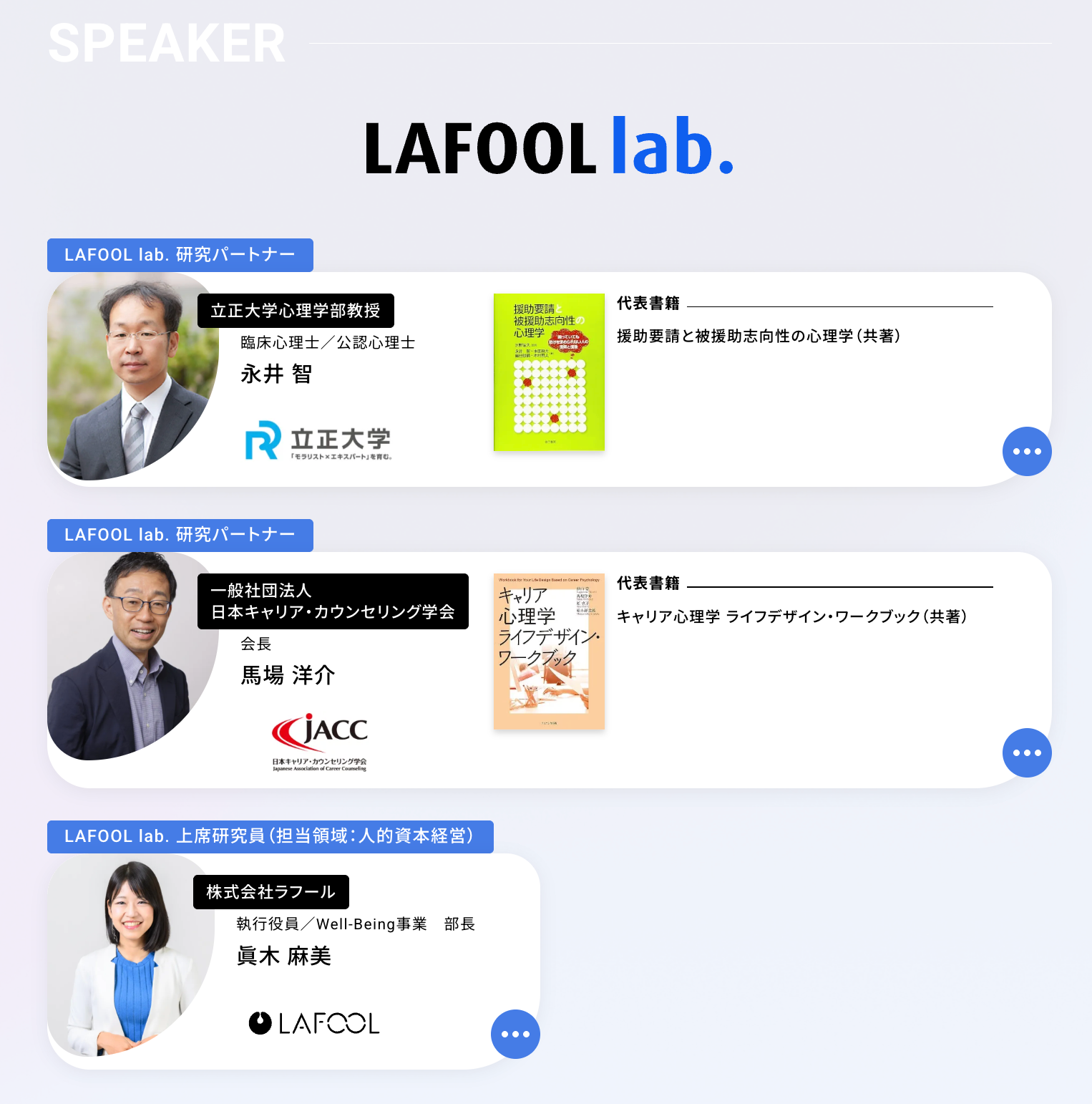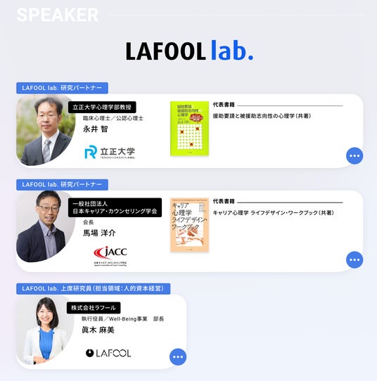 本講演に、日本における人的資本/ウェルビーイング経営をデータで推進する研究機関「Lafool lab.」の研究員3名、立正大学心理学部教授 臨床心理士/公認心理士 永井智 氏、一般社団法人日本キャリア・カウンセリング学会会長 馬場洋介 氏、株式会社ラフール 執行役員 眞木麻美 の登壇が決定しました。