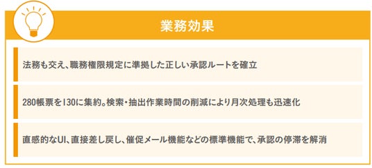 また、職務権限規定に基づいた正しい承認ルートがシステム上で担保され、不備申請の差し戻しや承認の停滞が大幅に減少。承認スピードの向上により、経営層から現場までを含めた意思決定の迅速化につながっています。