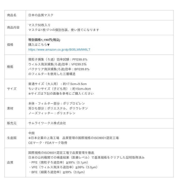 サムライワークス株式会社(代表取締役社長:新島 実 本社所在地:東京都渋谷区)は、相次いで発令される緊急事態宣言を受け、多くのお客様からの声にお応えし、安心・安全の高品質不織布マスク『日本品質マスク』の耳紐の耐久性をパワーアップさせ、amazon限定で追加販売を致します!『日本品質マスク』は、国際規格(ISO9001)認定されている日本企業の中国工場で品質管理を徹底したクリーンルームで製造しております。また、日本の検査機関でフィルター性能がPFE99.6%、BFE99.6%、VFE99.5%であることが証明されました。