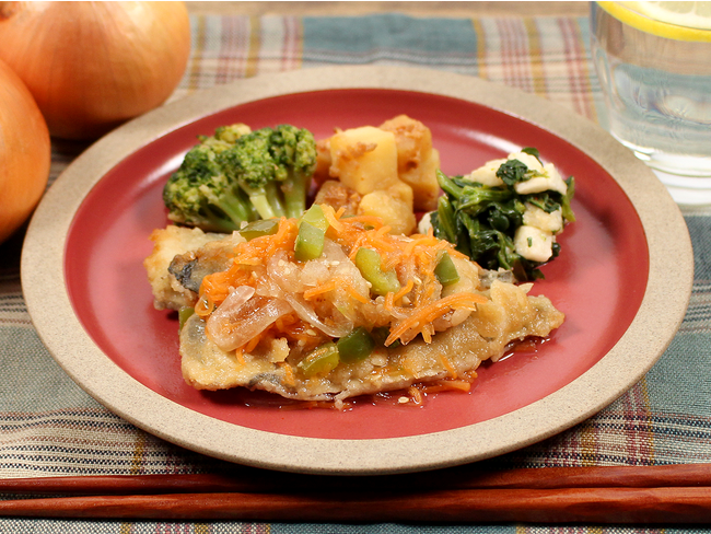 ふっくら揚げた九州産いわしの竜田揚げに、かつおと昆布の合わせだしを使用し、まろやかに仕上げた南蛮酢をかけました。付け合わせの野菜は玉ねぎ、人参、ピーマンを使用しております。