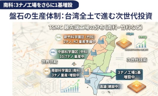 台湾(南部科学園区)での増設に加え、米国アリゾナ州の第2工場(27年下半期量産)、日本の熊本第2工場(28年量産)でも3ナノ製造プロセスを採用し、増産体制を急ピッチで構築しています。