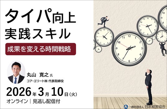 一般社団法人日本経営協会(所在地:東京都渋谷区、会長:高配 豪久)は、2026年3月9日(月)に、オンラインセミナー「タイムパフォーマンス向上【実践スキル】~成果を生み出すための「基本の型」を修得する~」を開催いたします。