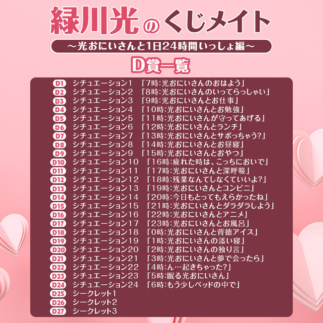 D賞の「シチュエーションボイス~光おにいさんと1日24時間一緒編~」は、シークレット3種類を含めた全27種類のオリジナルボイスです。C賞とは異なる内容になっており、光おにいさんが励ましてくれたり、そばにいてくれたりと聞くだけで前向きになれるような日常に寄り添うボイスをお届けします。「おはよう」の挨拶や、お昼に一緒にランチ、仕事の合間の休憩時間といった日常生活の一幕のシチュエーションのほか、一緒のお風呂タイムや、添い寝、光おにいさんと夢の中で会ったら…というようなドキドキのシチュエーションも含まれています。