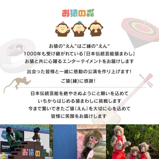猿回しは、猿と調教師が息を合わせて繰り広げる妙技やユーモアが特徴の日本伝統芸能。その巧みな演技には、子どもから大人まで誰もが目を奪われ、笑顔があふれます。猿たちの見事な技と愛らしい表情は、観る者の心を和ませ、特別なひとときを演出します。ぜひご家族みなさまでお楽しみください。