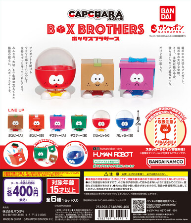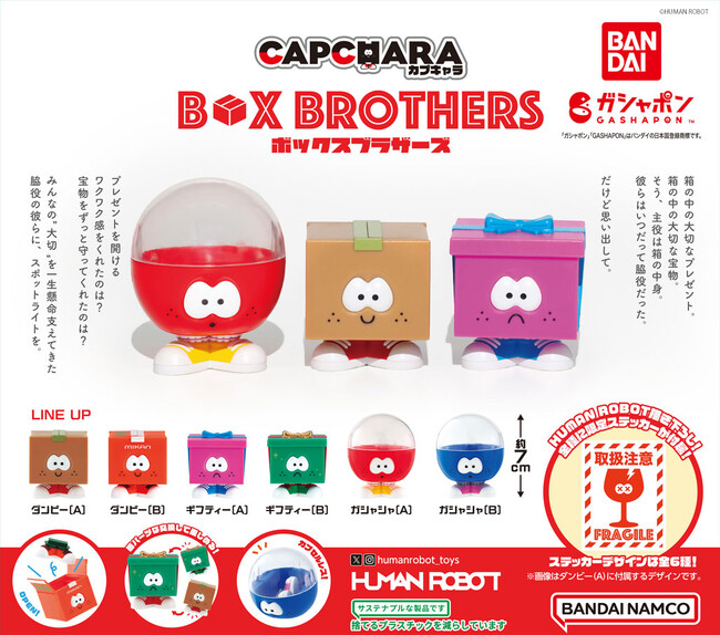 株式会社バンダイ ベンダー事業部(本社:東京都台東区)は、人気クリエイターHUMAN ROBOTが描く新キャラクターをマスコットフィギュアにした「カプキャラ BOX BROTHERS」(1回 400 円・税10%込、全6種)を2024年8月第4週から順次、全国のガシャポンバンダイオフィシャルショップ、玩具売り場・量販店・家電店などに設置されたガシャポン自販機シリーズにて発売いたします。
