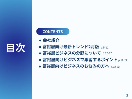本レポートでは、富裕層マーケティングにおける重要な要素と購買行動に影響を与えるポイントを解説し、最適なアプローチ手法をご紹介します。富裕層の集客に効果的なマーケティング手法や事例を抑え、事業運営にご活用ください。