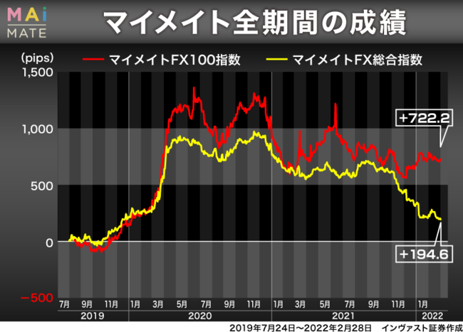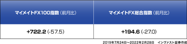 2022年2月のマイメイトFX100指数は月初に下振れてしまい、その後は底堅く推移したものの、+722.2pipsと前月比では-57.5pipsで終えました。