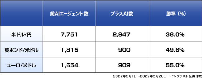 それぞれの勝率(「エージェント」総数と2月中成績がプラスだった「エージェント」の割合)を見てみると、米ドル/円は前月比-27.1%、英ポンド/米ドルは前月比+13.5%、ユーロ/米ドルは前月比-5%。米ドル/円は大きくダウンしました。