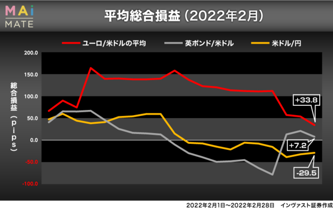 2022年2月における主要3通貨ペアの全「エージェント」をもとにした平均総合損益を確認していきます(実情を正確に反映するため誕生後に一度も取引していない「エージェント」は排除 )。