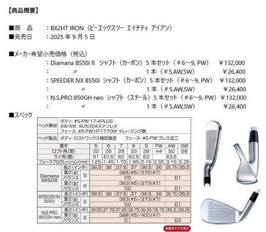 メーカー希望小売価格※1は、#6~9、PWの5本セットで132,000円(Diamana BS50iIIシャフト/SPEEDER NX BS50i シャフト/N.S.PRO 850GH neoシャフト仕様)、単品(#5、AW、SW)1本26,400円にて発売します。