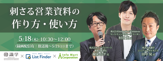 (本社:東京都渋谷区、代表取締役社長:遠藤俊一、以下「Innovation X Solutions」)は、「刺さる営業資料の作り方・使い方」をテーマとした共催セミナーを2023年5月18日(木)に開催いたします。