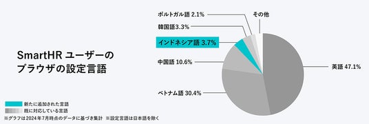 また、厚生労働省の発表によると、日本で働く外国人労働者のうちインドネシア人の増加率は対前年比で50.6%と国籍別で最も多く(※1)、日本の労働市場における存在感は急速に高まっています。さらに、「SmartHR」を利用するユーザーのブラウザ設定言語を見ても、インドネシア語は「SmartHR」の未対応言語の中でも3.7%と最も大きな割合を占めています。こうした状況とお客様からのご要望の高まりを受け、より多くのユーザーにとって使いやすいサービス環境を提供するため、この度インドネシア語の対応を開始しました。