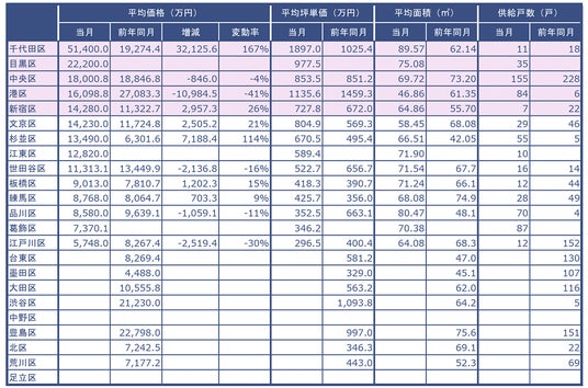 東京23区の各行政区毎に、平均価格、平均坪単価、平均面積、供給戸数をまとめました。当月の平均価格が大きい順に表示しています。
