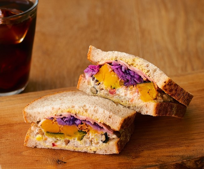 「25品目サラダと合鴨スモークのカンパーニュ」は、創業25周年にちなんで25品目のサラダを合鴨スモークと合わせたヘルシー感のあるサンドイッチです。ライ麦入りのカンパーニュで風味豊かな味わいに仕上げました。