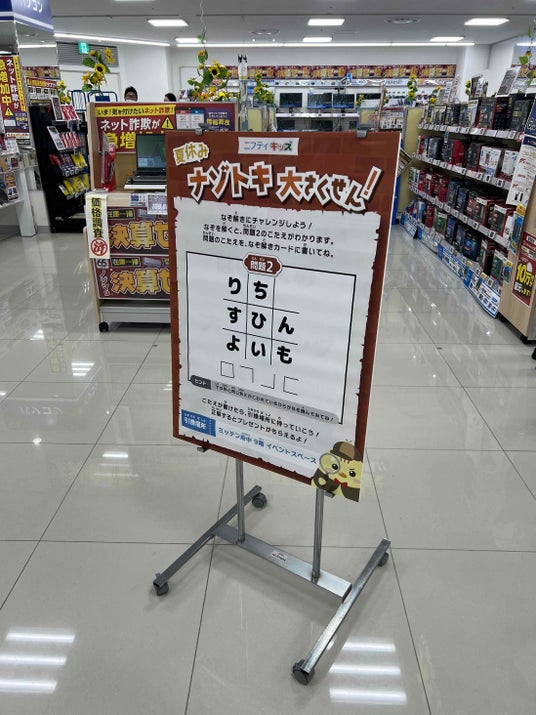 受付で配布したナゾトキカードのナゾを解くと、次の謎が設置されている場所の名前となり、館内を歩きながらナゾトキにチャレンジしてもらいました。ナゾトキに参加してくれた人には、「ニフティキッズ」のキャラクター「ひよりん」のお水をプレゼントしました。