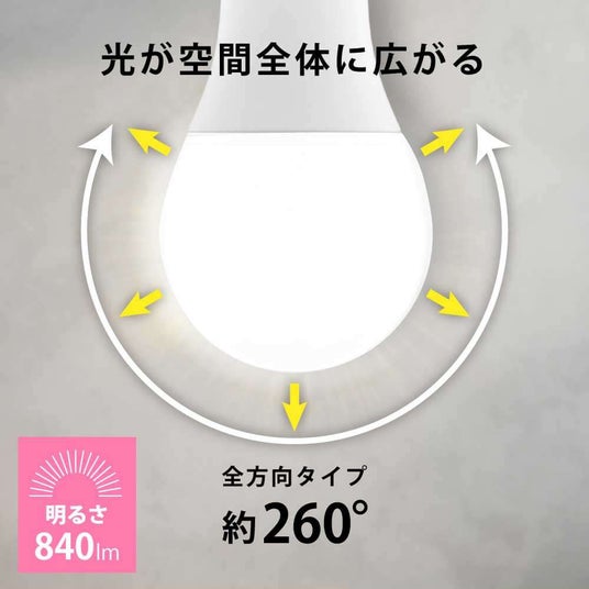 配光角約260°の全方向タイプで、明るさは840ルーメン(lm)となっており、様々な照明器具に使用できます。
