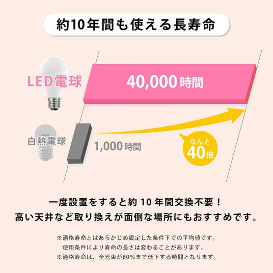 長寿命にすることで面倒な電球交換の手間を減らしました。電気代も一般的な白熱電球と比較するとお財布にも優しく、省エネ仕様の電球です。