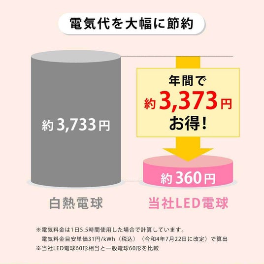 ※適格寿命とはあらかじめ設定した条件下での平均値で、全光束が80%まで低下する時間となり、使用条件により寿命の長さは変わることがあります。また、電気料金は1日5.5時間使用、電気料金目安単価31円/kWh(税込・令和4年7月22日改定)した場合で計算し、また、当社LED電球60形相当と一般電球60形を比較しています。