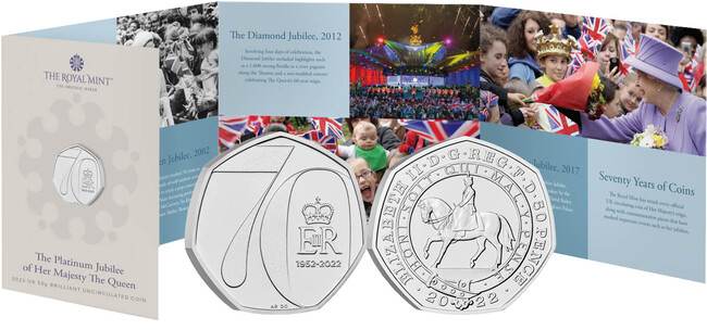 女王が即位されてから70周年を迎えることを記念した50ペンス白銅貨。ジュビリーヒストリーブックレット入りの完全保存版です。