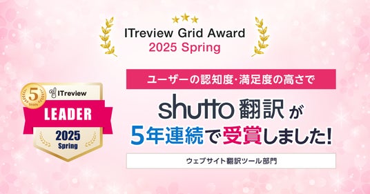 “おもてなしを科学する”株式会社イー・エージェンシー(本社:東京都千代田区、代表取締役:甲斐真樹)が提供するプロダクトブランド「さぶみっと!」のひとつ、ウェブサイト翻訳ツール「shutto翻訳(しゅっと ほんやく)」は、2025年4月16日に発表されましたアイティクラウド社主催の「ITreview Grid Award 2025 Spring」において、ユーザーから高い評価を受け、ウェブサイト翻訳ツール部門で5年連続の「Leader」を受賞しました。