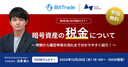 ビットトレード株式会社(本社:東京都港区、代表取締役社長:関 磊、以下「ビットトレード」)と株式会社Aerial Partners(本社:東京都港区、代表取締役社長:沼澤 健人、以下「Aerial Partners」)が2024年12月26日19時より、確定申告期に向けた「暗号資産の税金セミナー」の第1回を実施いたします。