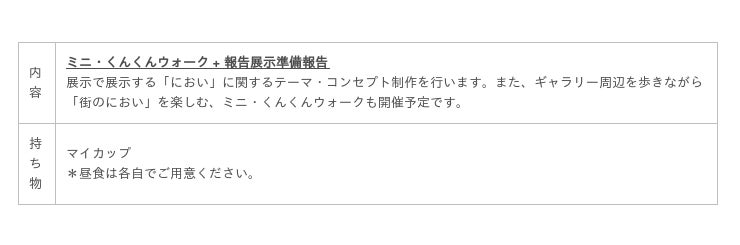 1回目では井上尚子さんと、ゲスト講師の白須未香さん(嗅覚研究者)とともに、オリジナル薬膳茶の香りと味覚、自宅から持参した「気になるにおいのもの」を介して「においの記憶」を語らいます。2回目は生い立ちから今まで経験したにおいについて振り返り、自分自身の「におい年表」を作成します。3回目では、ギャラリー周辺を歩きながら「街のにおい」を楽しむ“ミニ・くんくんウォーク”を予定。さらに、6月にはワークショップを通して制作した「においの年表」と個々の人生を象徴するにおいのものを展示する小さな展覧会を開催します。