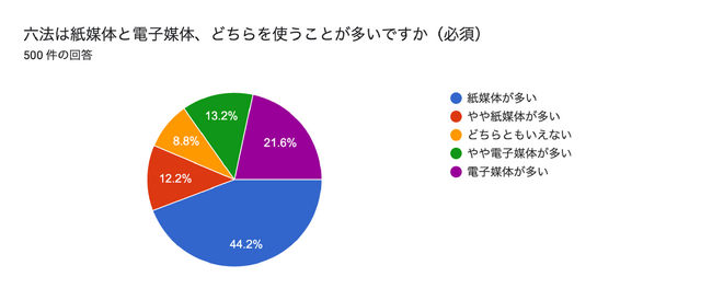 弁護士ドットコムが実施したアンケートでは、六法全書の紙・電子書籍利用状況に関して、「紙媒体での利用が多い」と答えた弁護士は全体の44%にのぼり、「電子媒体が多い」と答えた弁護士の2倍以上が紙での利用を継続していることがわかりました。(アンケート期間 2023年4月23~24日 回答弁護士500名)