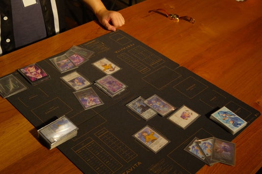 会場中央にはゲームプレイエリアが。「バーチャルシンガー」を題材とした完全新規のオリジナルトレーディングカードゲーム『フェスタヴィータ(FestaVita)』をスタッフから直接レクチャーを受けながら体験することができた。