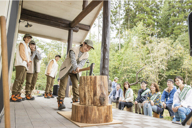 ログハウスの完成を記念して執り行われた竣工式には、長柄町の月岡町長や地元企業など、本プロジェクトの関係者およそ50名が参加。鏡開きをアレンジした薪開きや、「DIY女子部」を中心としたプロジェクトメンバーへの「セルフビルドサポーター」※の資格贈呈などが行われました。完成したログハウスは、長柄町への移住に興味がある方に向けた、お試し居住の滞在先として活用していく方針です。