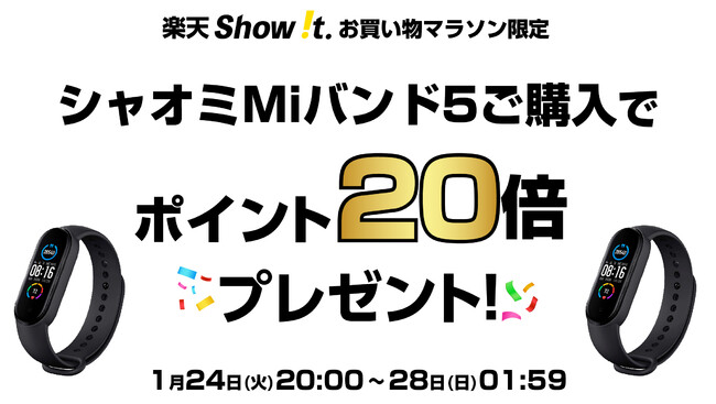 楽天市場「Show !t」は1月24日(火)20時からシャオミのMiバンド5ご購入の方にポイント20倍プレゼントを実施します。また、1月24日(火)20:00~1月28日(土)01:59まで開催される、楽天お買い物マラソンに参加し、全商品ポイント10倍プレゼント(一部商品を除く)を実施します。この機会にシャオミのスマートバンドMiバンド5でポイントをザクザク貯めましょう。