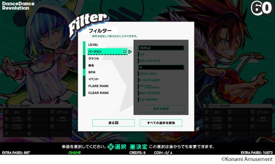 また、前作までは公式サイト上でしか設定変更できなかったオプション項目がゲーム内で設定できるようになったほか、様々な条件を指定してプレーしたい楽曲を絞り込むことができる「フィルター」機能を追加しました。