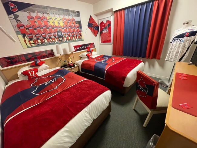 チームカラーである、KINGレッド・湊ブルーを基調にデザインされた客室は、選手の集合写真やクラブエンブレムがデザインされたベッドカバー、選手サイン入りユニフォームなどが随所にあしらわれており、滞在中も応援気分を楽しめます。さらに、宿泊料金の一部がクラブ強化資金として活用されることで、チームのサポートができる宿泊プランとなっております。