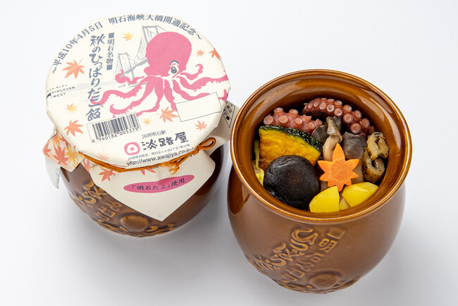 真だこと、穴子そして、季節の野菜を、独自に焼き上げた蛸漁に使用する蛸壺風の陶器に盛り付けました。味と陶器の容器、両方でお楽しみいただけるお馴染みのお弁当です。