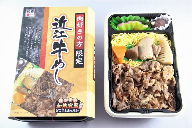 三大和牛の一つ、近江牛を使用した牛飯弁当を加熱容器に入れたタイプのお弁当です。